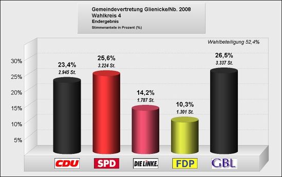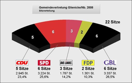 Die SPD hat sich deutlich bei der Kommunalwahl in Glienicke behauptet und wird mit 6 (+1) Gemeindevertretern in die Glienicker Gemeindevertretung einziehen . Lediglich die GBL erhielt 113 Stimmen (entspricht 0,9%) mehr.